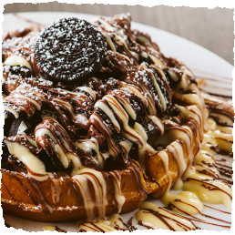 $24.00Gauffres belges avec crème anglaise, chapelure d’oréo et nutella (Belgian Waffle with English Cream, Oreo Crumbles, and Nutella)
