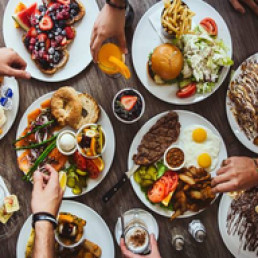 Deux œufs à votre goût avec jambon, saucisses, bacon, bologne, rôti de porc, cretons, cornichons, tomates, pommes de terre, fèves au lard, rôties, et café. (Two eggs any style with ham, sausages, bacon, bologna, roast pork, pork pate, dill pickle, tomatoes, fries, baked beans, toast, and coffee)